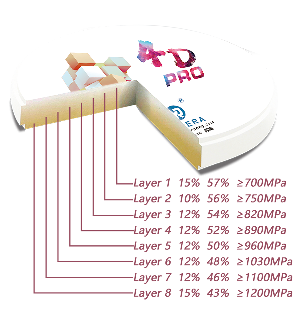 Dzięki 15-warstwowemu gradientowi przezierności (57–43%) i wytrzymałości na zginanie (800–1300 MPa) zapewnia naturalny efekt estetyczny oraz wysoką trwałość.